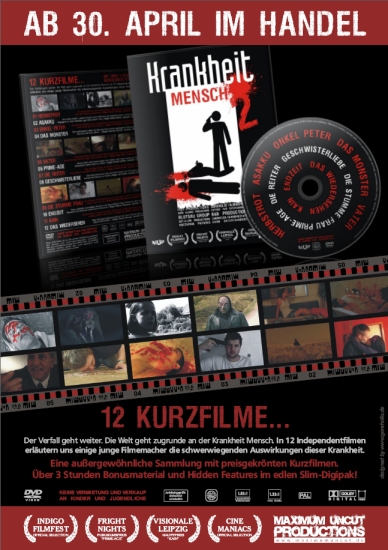 Am 30. April geht die kultige "Krankheit Mensch" DVD in die zweite Runde. Mit auf der DVD ist neben vielen anderen Kurzfilmen auch unser "DAS MONSTER" und massig Bonusmaterial enthalten. Wer etwas für den besonderen Film übrig hat, dem sei diese DVD wärmstens ans Herz gelegt. Die DVD kann hier bestellt werden, oder Ihr googelt einfach!